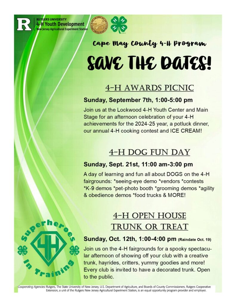 Main Content Save the Dates for these upcoming 4-H Events! Please call the Cape May County 4-H Office for more information at 609-465-5115. 4-H Upcoming Events Save the Dates Flyer PDF