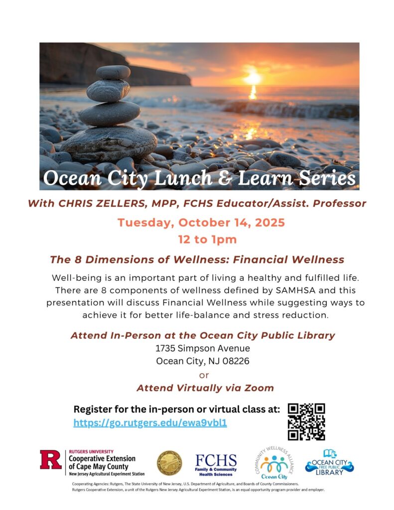 Cape May Court House, NJ – Rutgers Cooperative Extension of Cape May County Family and Community Health Sciences (FCHS) program is partnering with the Ocean City Public Library to present the workshop, The 8 Dimensions of Wellness: Financial Wellness, from 12 to 1 pm on Tuesday, October 14, 2025.