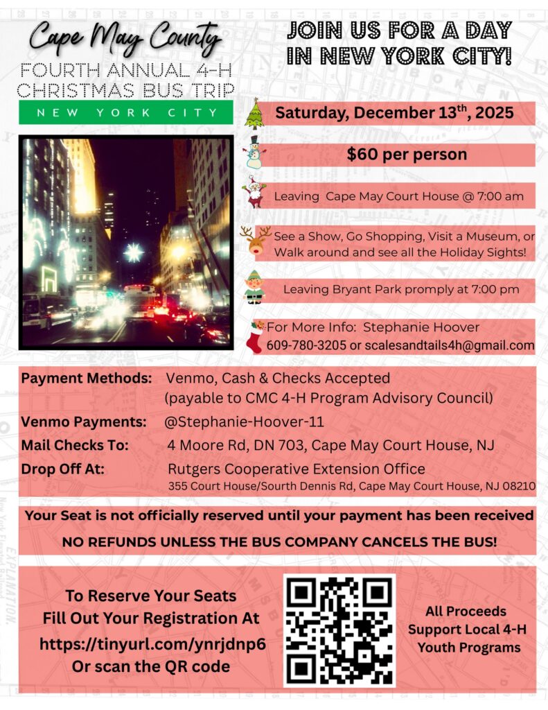 For your convenience, pay using Venmo @Stephanie-Hoover-11, with cash, or write a check payable to the CMC 4-H Program Advisory Council. Payment can be dropped off at the RCE of Cape May County Office or mailed to CMC 4-H, 4 Moore Rd, DN 703, Cape May CH, NJ 08210. Your seat is not officially reserved until payment is received. So, register now and join us for a day of holiday fun in the Big Apple.