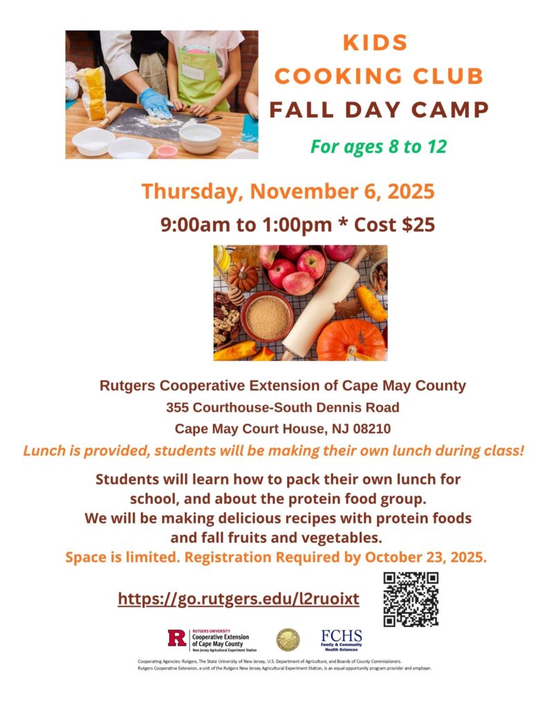 Cape May Court House, NJ – Rutgers Cooperative Extension of Cape May County Family and Community Health Sciences (FCHS) Program will hold a Kids Cooking Club Fall Day Camp on Thursday, November 6, 2025. The program, for children 8 to 12 years of age, will take place from 9am to 1pmat Rutgers Cooperative Extension, 355 Courthouse-South Dennis Road, CMCH, NJ 08210.