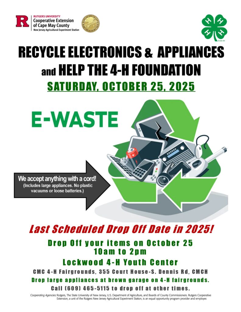 Cape May Court House – Have unused or broken electronics and electric appliances laying around? Donate them to 4-H! The Cape May County 4-H Foundation, Inc. will collect all types of electronics and electric appliances, including large items, as part of their e-recycling fundraising program on Saturday, October 25th from 10am to 2pm. This is the last scheduled drop off day for 2025!