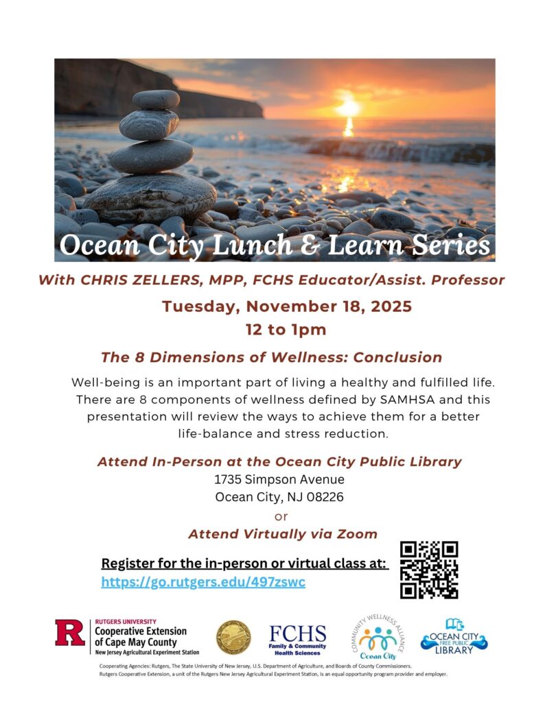 Cape May Court House, NJ – Rutgers Cooperative Extension of Cape May County Family and Community Health Sciences (FCHS) program is partnering with the Ocean City Public Library to present the workshop, The 8 Dimensions of Wellness: Conclusion, from 12 to 1 pm on November 18, 2025.
