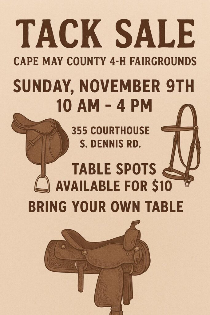 Cape May Court House – The Cape May County 4-H Horse Council will hold a Tack Sale on Saturday, November 09, 2025. The event will take place from 10 am to 4pm on the Cape May County 4-H Fairgrounds, 355 Court House – South Dennis Road, Cape May Court House, New Jersey 08210.