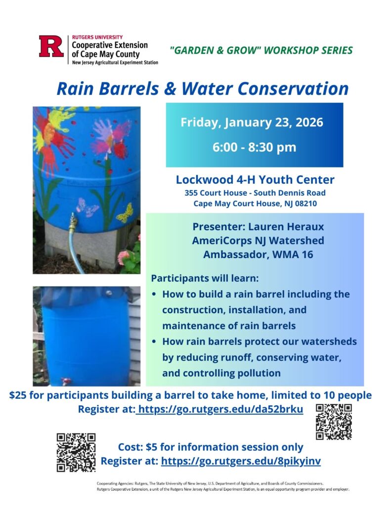 Cape May County Agriculture and Natural Resources Department presents the workshop Rain Barrels and Water Conservation on Friday, January 23, 2026. The workshop will take place from 6pm to 8:30pm at the Lockwood 4-H Youth Center, 355 Court House – South Dennis Road, CMCH, NJ 08210.