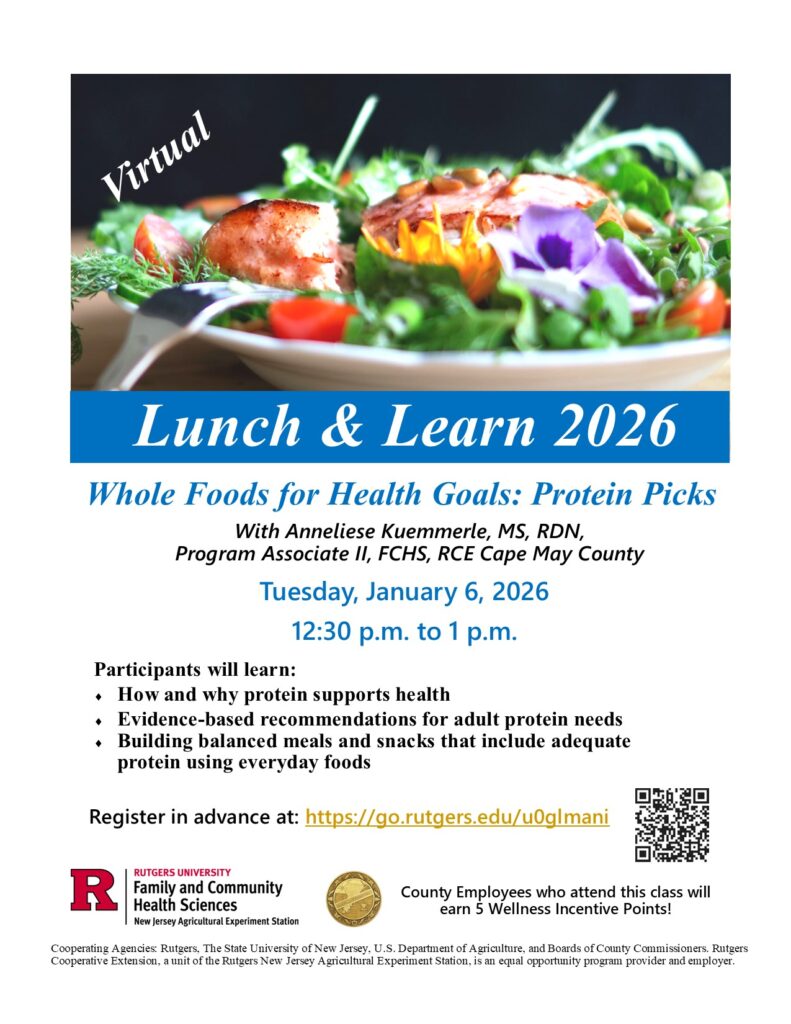 Cape May Court House, NJ – Rutgers Cooperative Extension (RCE) of Cape May County Family and Community Health Sciences (FCHS) Program will hold the virtual Lunch & Learn Program, Whole Foods for Health Goals: Protein Picks, from 12:30 to 1:00 p.m. on Tuesday, January 6, 2026.