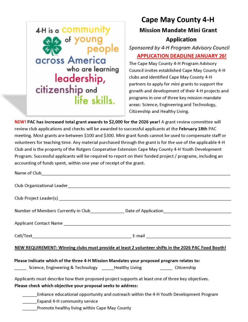 The 4-H Program Advisory Council (PAC) is now accepting applications for 2026 4-H Mission Mini Grants. PAC began awarding 4-H club educational grants in 2013. Since then, PAC has presented an amazing $15,350 to Cape May County 4-H clubs.