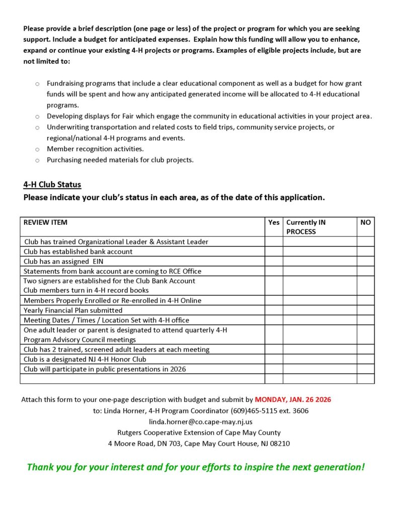 The grants are an excellent way to help clubs meet their educational goals. Club grants are normally awarded in the amounts of $100 to $300 with a maximum of $500. It is easy to apply, open the attached fillable PDF, complete the application and email it to the Cape May County 4-H office. The deadline to apply is January 26, 2026.