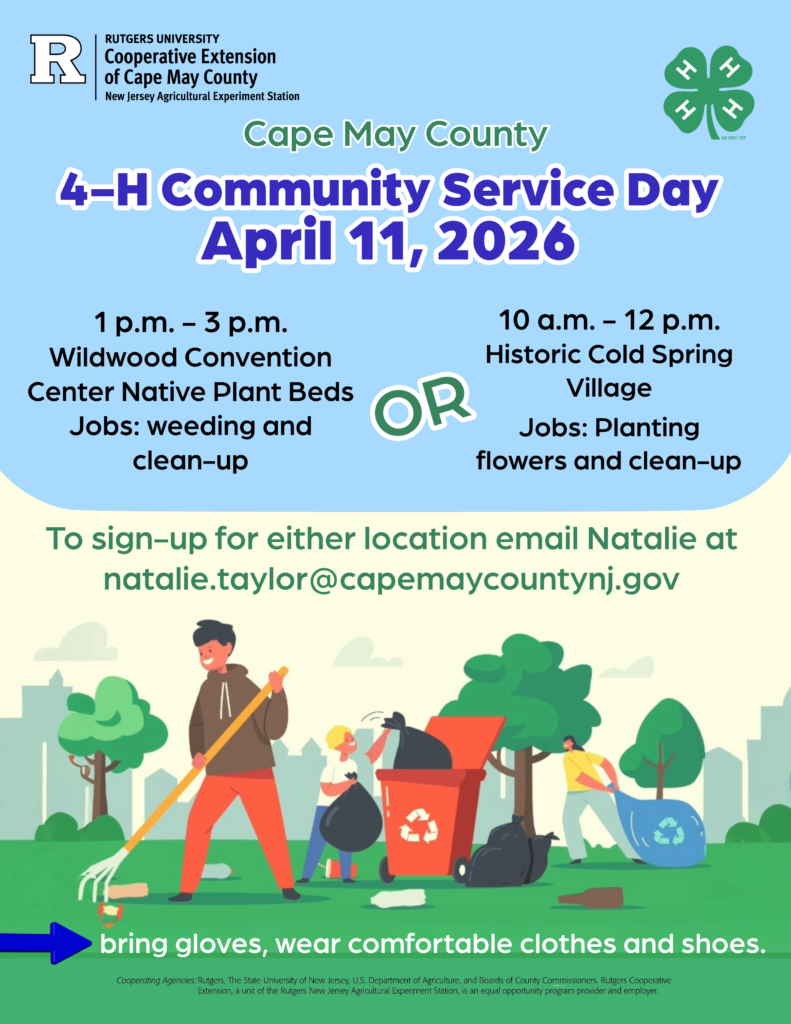 The Cape May County 4-H Community Service Day will take place on Saturday, April 11, 2026 at both Cold Spring Village and the Wildwoods Convention Center. For more information or to sign up for either location, please call 609-465-5115, Ext. 3605 or email natalie.taylor@capemaycountynj.gov