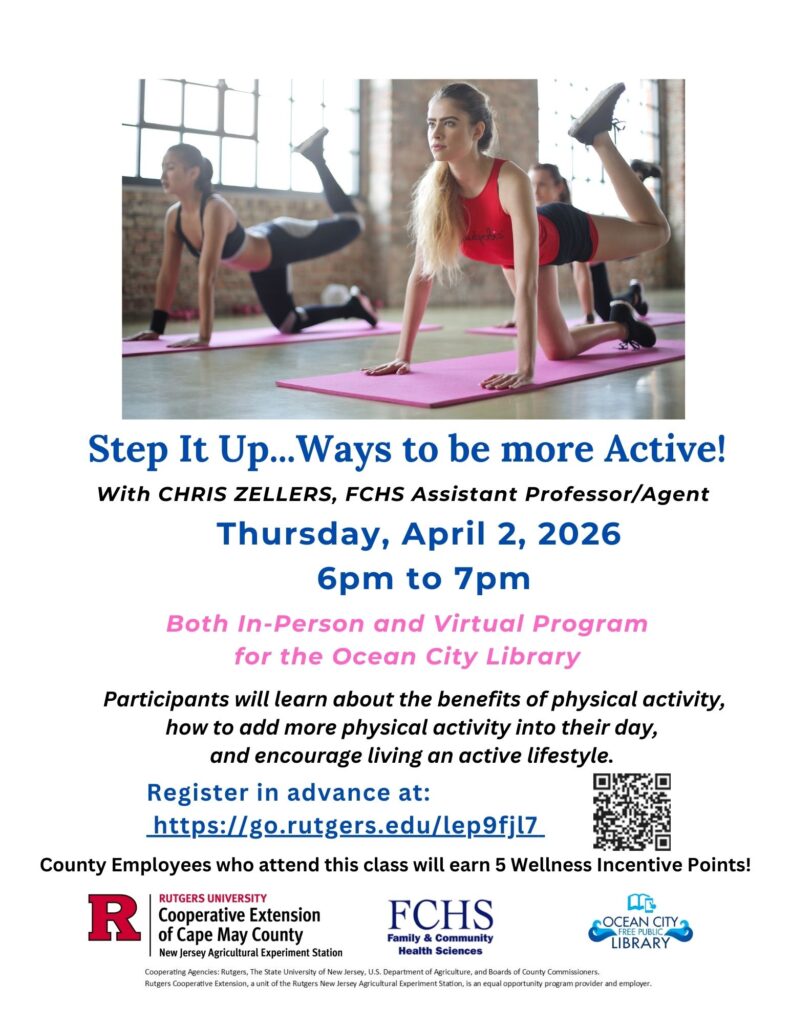 Cape May Court House, NJ – Rutgers Cooperative Extension of Cape May County Family and Community Health Sciences (FCHS) will present the program,Step it up…Ways to be More Active, from 6 to 7pm on Thursday, April 2, 2026. This presentation is offered both in-person and virtual. It will be held at the Ocean City Free Public Library, 1735 Simpson Avenue, Ocean City, NJ.